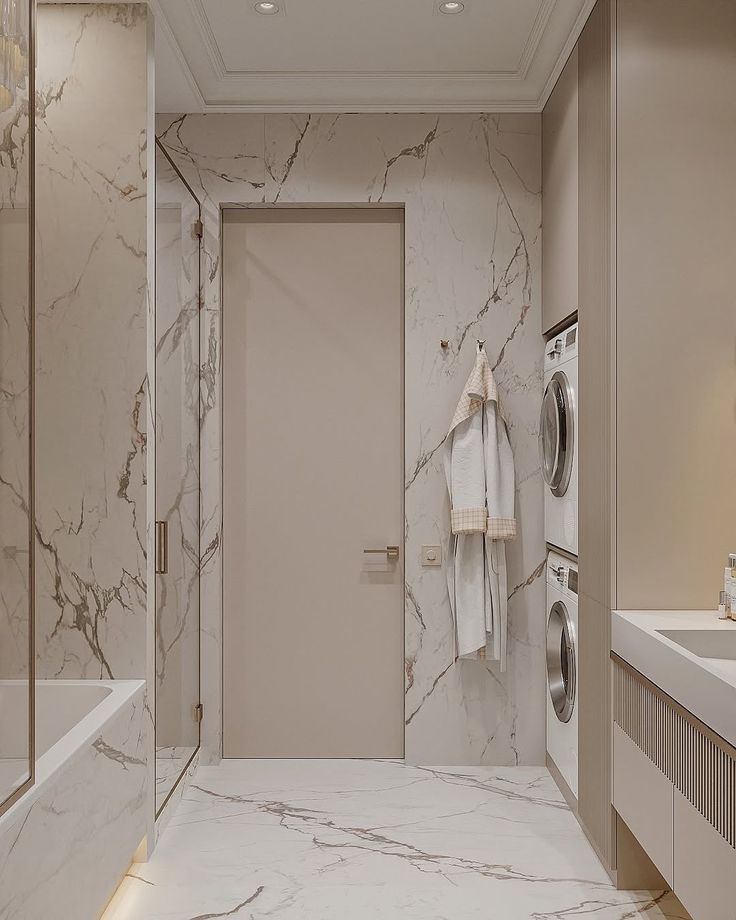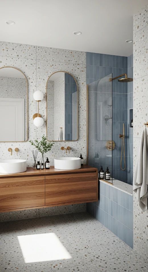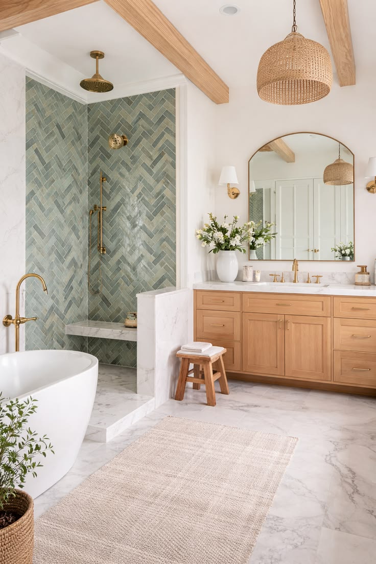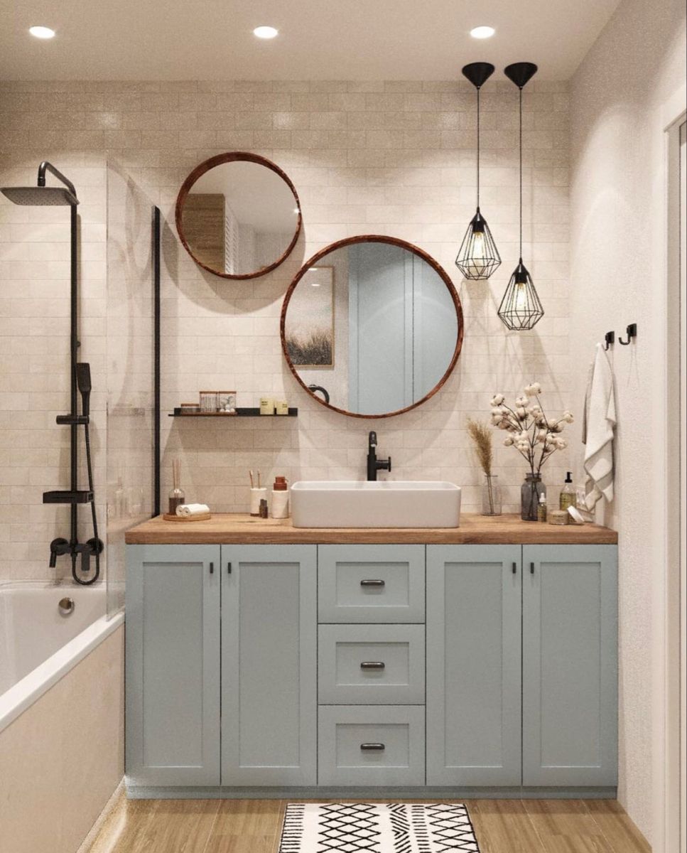 Что отличает такую ванную? Пожалуй, обилие красивых текстур, подобранной плитки, фурнитуры и конечно же мебели! Вдохновитесь для создания ванной комнаты мечты